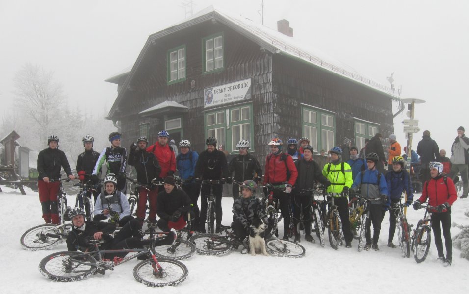 Letos dorazilo více lidí z větší dálky, dva bikeři z Oder přijeli na dvoukole, Martin a Radek přijeli z Ostravy a ještě pak za námi do chaty přiběhl Zbyňa z Delfou, kteří přiběhli z Lysé hory.... V kopřivnici se nás sešlo 18 bikerů na 17 kolech a 1 pes, Giro. Vlastní vyjížďka probíhala v pohodě, silnice byly ve městě bez sněhu, mokré. V Kopřivnici si někteří dali na kruháči 12 koleček, pak jsme jeli po bílé, trochu posněžené alkocestě do Lichnova, tam se přidal Hynek, příjemná zastávka u Vláďě v Bordovicích, ve Veřovicích na nádraží jsme počkali pár minut na Pika a pak jsme už začali stoupat po zasněžené cestě na vrchol Velkého Javorníku. Zezačátku sníh křupal, nahoře se to spíš propadalo, bylo třeba držet přesně stopu. Dalo se to ale v pohodě vyjet, i na ojeté gumě :-) Na sjezd přímo z vrcholu se heclo letos více lidí a bylo to fajn, dalo se to. Hned na prvním rozcestí to Hyna zpestřil pádem, jak můžete vidět ve videu :-) jeli jsme ale dál, odvážlivci přes serpentyny. Nakonec jsme všichni dojeli k chatě ve Veřovicích, kde jsme si dali mimo jiné zelňačku, klobásu, aj. Domů jsme odjížděli po skupinkách, poslední jsme ještě vyjížděli za světla, nebo šera a do Kopřivnici jsme přijeli za úplné tmy. Se Sigym jsme si dali ještě sjezd lesem po tmě, jen s jednou čelovkou :-) Beskydské MTB info | WWW rozcestník | seznam maratonů | Kopřivnický DRTIČ | CykloArt bike klub | beskydské trasy |